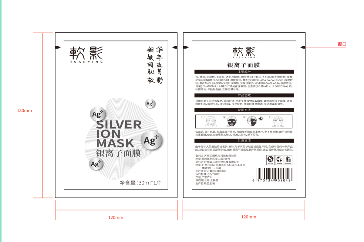【品牌介紹】銀離子面膜|抗痘消炎凈膚,銀離子面膜,通過特殊的處理,將納米銀覆著在無紡布上,不間斷的釋放出銀離子,提升膚色,使肌膚飽滿,光潔而有彈性,整個包裝設計考慮到銀離子的特性,色彩以銀色為準,加上凹凸和燙銀的工藝,彰顯品質感。