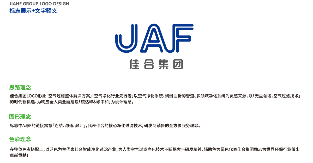 色彩理念:在整體色彩搭配上,以藍色為主代表佳合智能凈化過濾產業,為人類空空氣過濾凈化技術不斷探索與研發精神,輔助色為綠色代表佳合集團勵志為世界環保行業做出卓越貢獻!