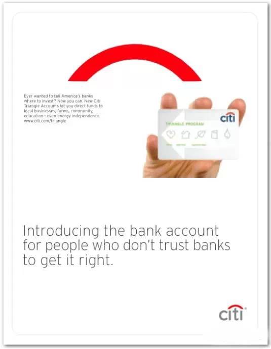 CITI銀行的廣告簡潔大氣,但統一延用了標識的核心基因——代表傘的紅色圓弧,顯得很聚焦且有品牌識別力。