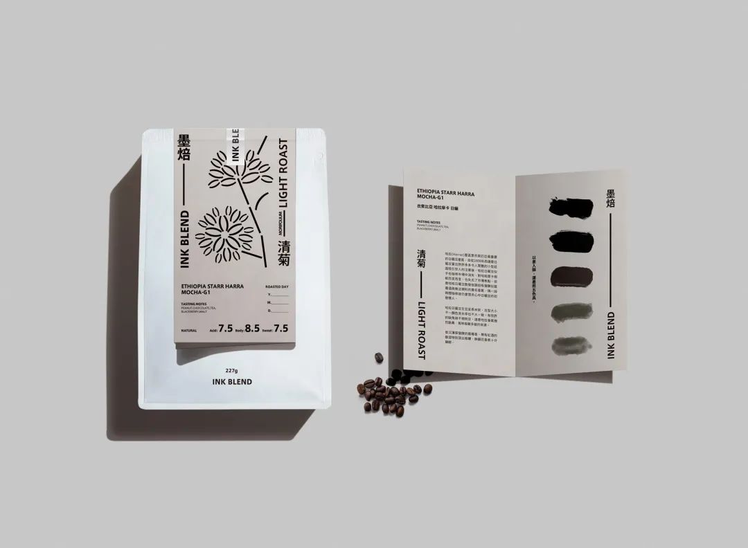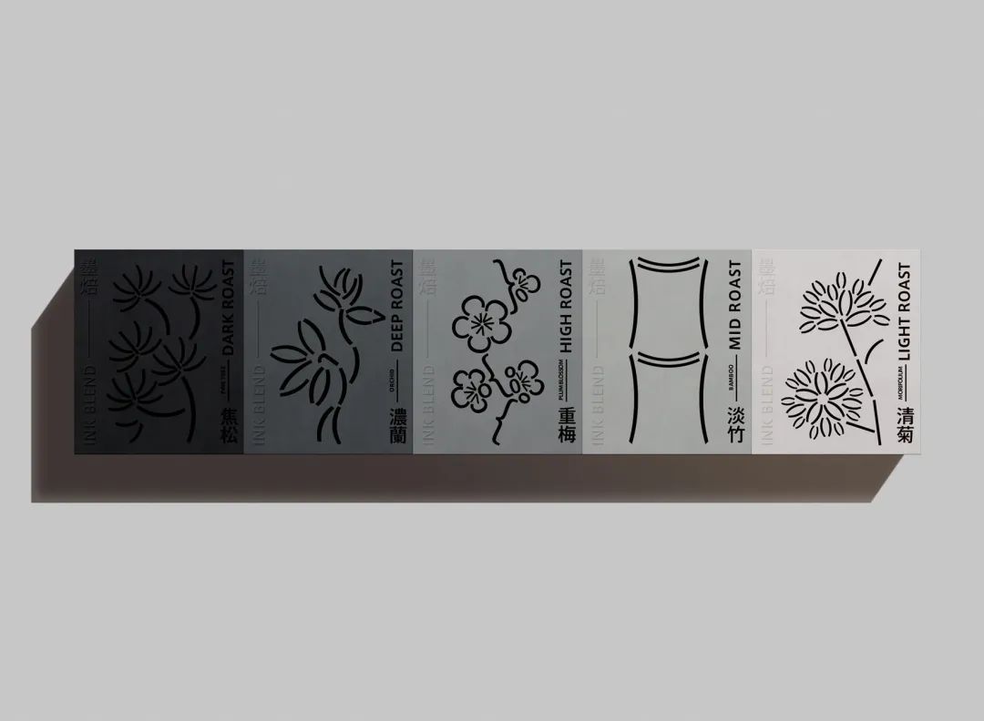 墨有「墨分五色」之說,指墨色從濃至淡的多種變化。以墨分五色為概念,將水墨畫中的花草題材與咖啡烘焙度、風(fēng)味結(jié)合,焙有焦、濃、重、淡、清,韻有梅、蘭、竹、菊、松。