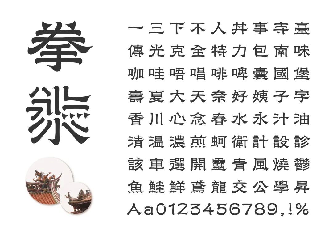 拳體是一款揉盒隸書體與臺灣廟宇燕尾造形的繁體中文字型。拳體有著廟宇屋檐燕尾的尖銳利落感,也有著隸書寬扁樸拙的復(fù)古身形與在地人文氣息。直筆與橫筆則嘗試打破書法規(guī)則,傳統(tǒng)韻味中流露摩登鋒芒。筆畫轉(zhuǎn)折如拳頭般有力,因此取名為拳體。