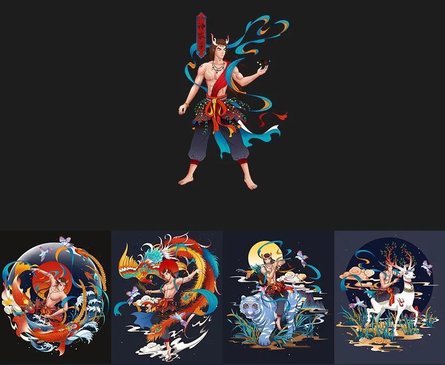 中國民間一直流傳著神話故事和人物,有 一定的群眾基礎(chǔ)和吸引力,也是“國潮”很好的創(chuàng)意方向。在民間神話的基礎(chǔ)上重新創(chuàng)造結(jié)合IP形象,讓品牌更有故事性、神秘感和吸引力。這款大米包裝以“神農(nóng)”與“后稷”的民間神話故事為基礎(chǔ),二者均是與農(nóng)業(yè)、糧食密切相關(guān),結(jié)合兩大人物IP形象自帶“國潮”光環(huán)。并在具體的人物形象上,采取流行的國漫風(fēng)格。將大米、稻穗等代表糧食的元素作為配飾運(yùn)用在IP形象上,并融入傳統(tǒng)圖案和糧食元素的場景,非常具有產(chǎn)品特色的國潮風(fēng)。