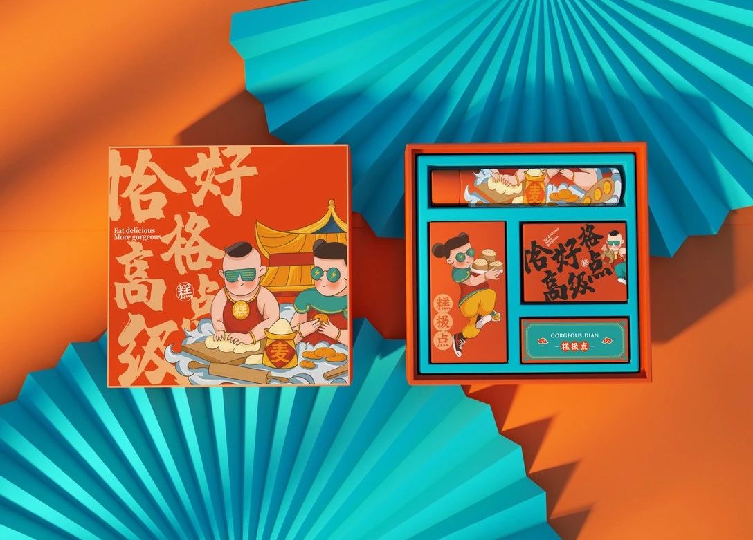 從這個食品包裝設(shè)計(jì)可以發(fā)現(xiàn)在糕極點(diǎn)是走的國潮糕點(diǎn)的路線,突出有潮范的東方腔調(diào),用年輕人喜歡的方式展示出來。設(shè)計(jì)的理念也很是不錯:清明橋上曲悠悠,潑茶蒸餅俏眉頭,并把潮流來混搭,滿屋老小見歡喜。勾勒出了一個新潮又復(fù)古的東方世界。摒棄糕點(diǎn)固化的傳統(tǒng)模式,不斷強(qiáng)化無錫本土品牌概念,以大阿福作為本土形象代言。阿福福德德,阿喜客氣頭。本土潮仔,由無錫泥人演變而來,寓意送福送喜、祥瑞云集。把墨鏡、運(yùn)動鞋等時尚元素加入其中,實(shí)現(xiàn)糕點(diǎn)與新國潮IP的跨界聯(lián)合。品牌主色調(diào)為愛馬仕橙與綠,色彩之間碰撞和對比,呈現(xiàn)出強(qiáng)烈的視覺沖擊力。表達(dá)出品牌內(nèi)核的力量,年輕張揚(yáng),自由無懼,充滿無限可能。