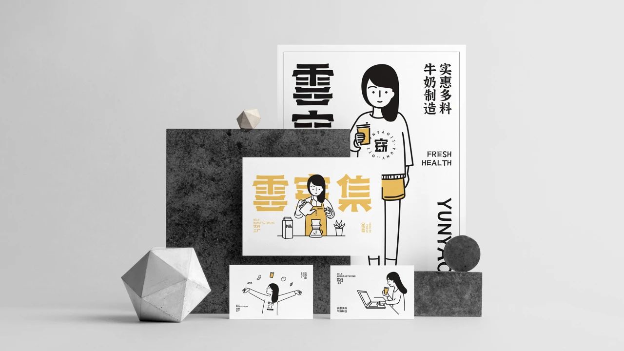 這個叫云窈集的茶飲品牌,是一個主打年輕化的品牌。云窈集的LOGO設計是圖形+中文+拼音的組合,圖形部分是一位女孩子垂眸品嘗一杯茶飲,中文字體部分采用了少筆畫的處理方式,繁體“雲”最下面的筆畫簡潔成一筆,集則是直接少了一豎,是比較符合當代年輕人的喜好的表現方式。LOGO的圖形延伸成多個動作不一的女孩形象,用漫畫的形式表現出來,顏色上采用了暖色系的黃色,漫畫女孩身上或多或少地帶上相應的黃色,給人一種溫暖清新的感覺。輔助圖形用標志字體的偏旁抽象而成,代表了云窈集飲料工廠。云窈集的飲品包裝主要是從標志入手,將標志進行不同方式的組合,從而形成豐富的包裝樣式。物料的設計則是標志和漫畫的搭配使用,漫畫女孩的神情和動作傳達出熱愛生活的感覺,生活很苦,但依舊可以選擇熱愛。