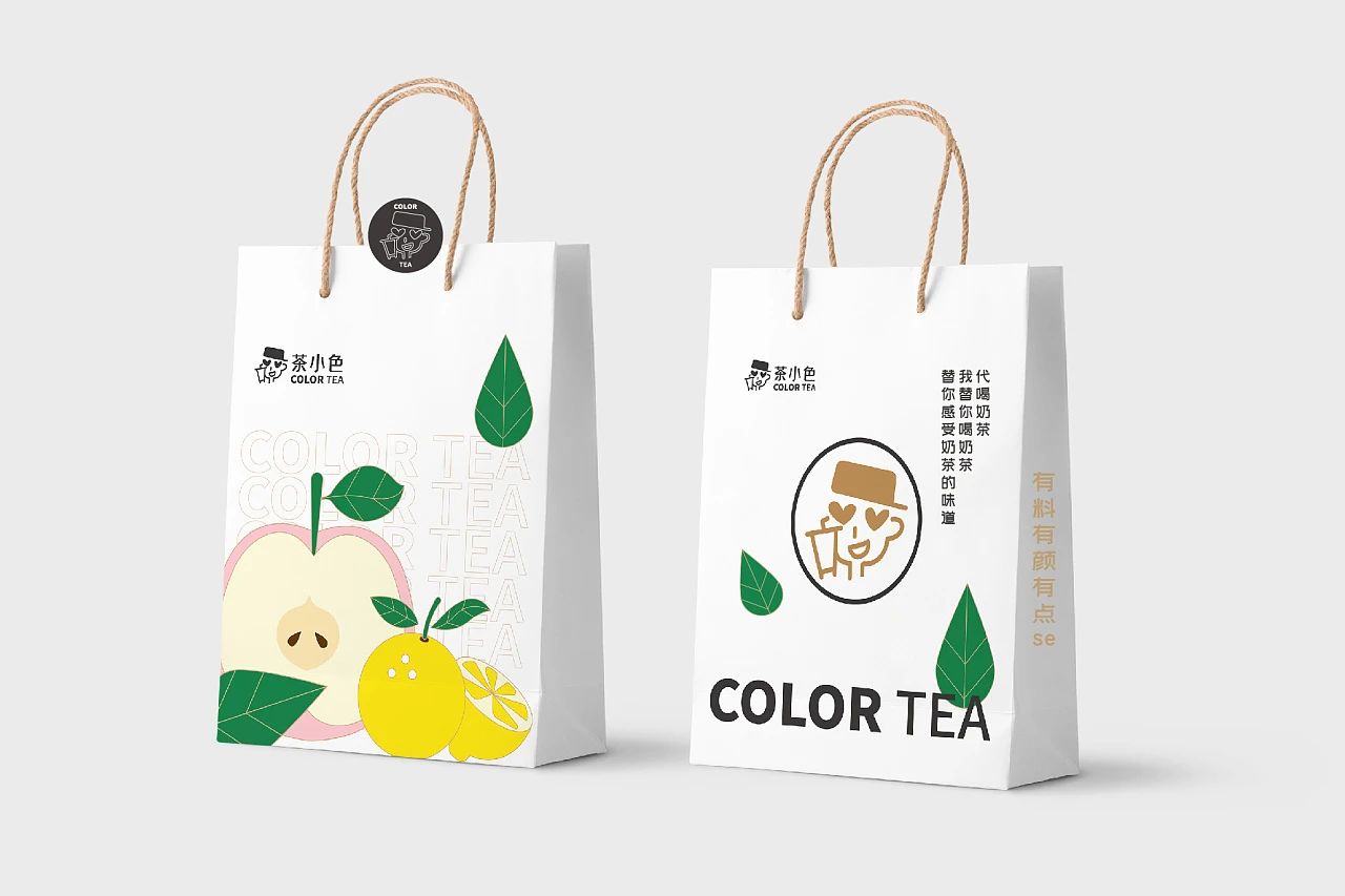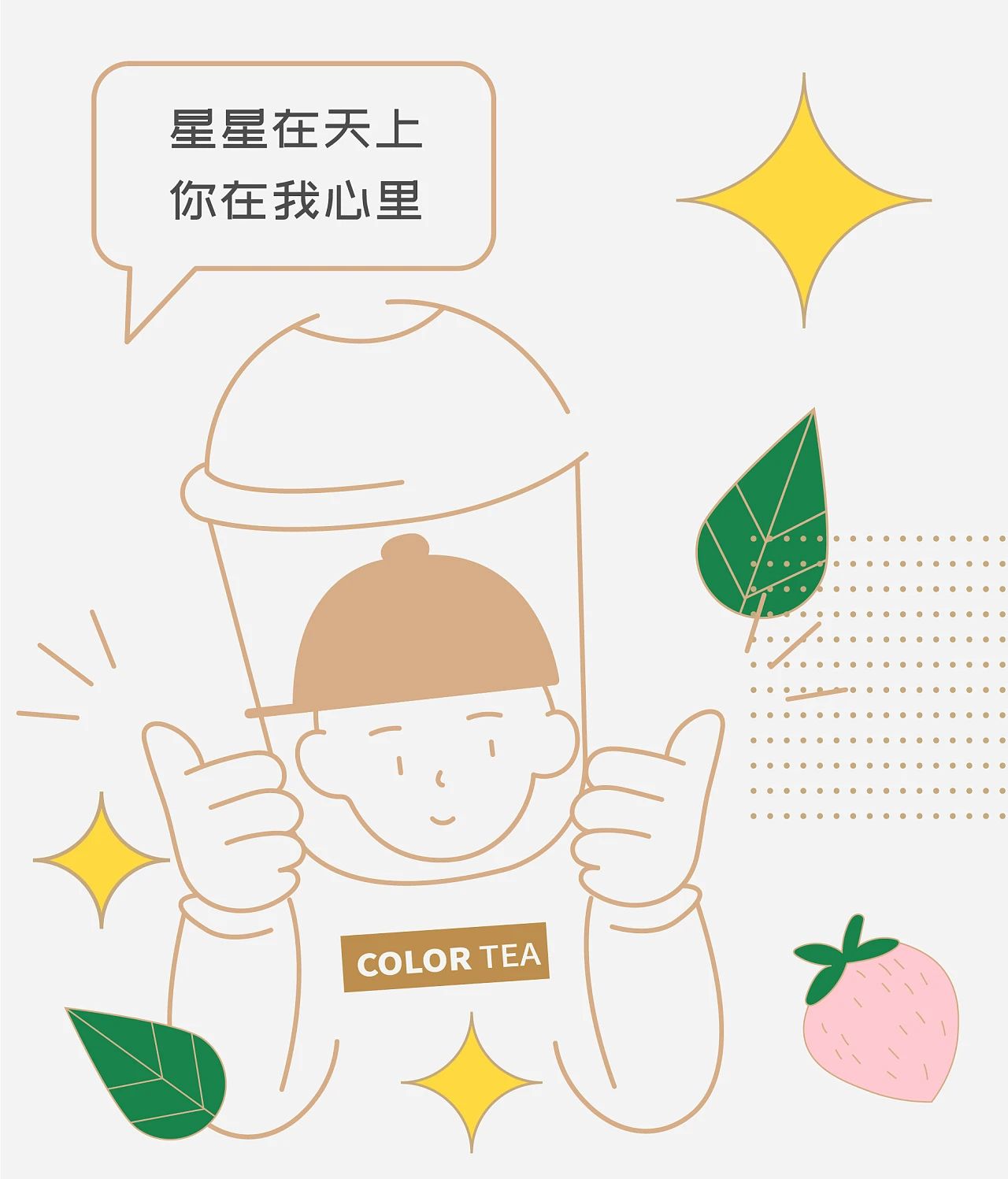 茶小色的LOGO運用一位手持奶茶杯,頭上反戴著鴨舌帽,將眼睛畫成一對愛心形狀的小男孩作設計,整體看起來憨憨的特別可愛,而且LOGO是由品牌IP簡化而來,突出品類,與品牌調性一致。因為茶小色主要突出”色“字,所以整個品牌都是圍繞著這個字的意思來設計。品牌輔助圖形比較的別致,一個圓形內部寫著“se”兩個拼音字母,上面寫著一句土味情話,下面放著一句狠話,兩句話在一起,讓人哭笑不得,感覺非常的可愛。該品牌設計最有趣的地方就是這里,將IP延展出來插畫。插畫做的也是挺細心的,一位小青年眼睛變為心形,看著手中的奶茶,說著土味情話,將IP塑造成一位可愛憨厚的”渣男”形象,讓人感覺十分有趣。細節方面處理的也不錯,背景有著奶茶中經常出現的黑珍珠,因為是夏天,所以還有相應的冰塊出現在畫中。