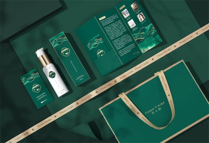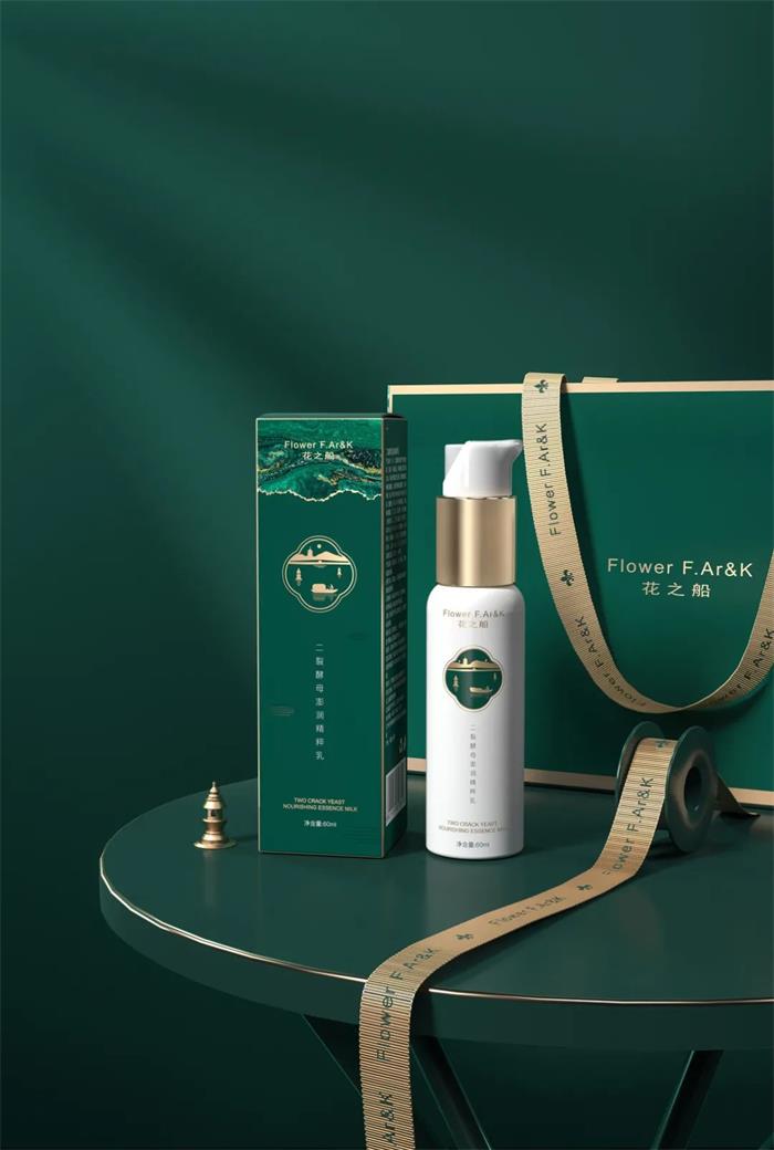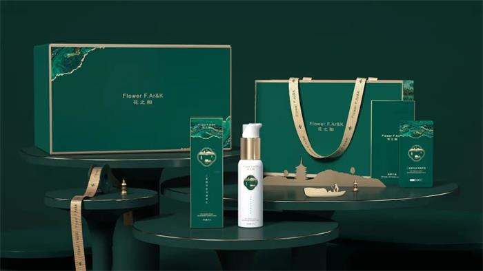 秉承“以花為船,臨水作賦”的花之船品牌,墨綠色的外盒包裝,用花與水的復(fù)合圖形搭配西子湖畔,既是對品牌主題的呼應(yīng),也傳遞了品牌獨(dú)有的情感給消費(fèi)者。整體呈現(xiàn)動靜相稱、疏密對比的布局,品牌徽標(biāo)勾勒了西湖景色,畫面中錯落的葫蘆塔與湖面小舟,結(jié)合金邊之外的綠海汪洋,象征著品牌抗衰的自然力量。另外徽標(biāo)輪廓上加入了幾簇水紋,而波光之中的倒影石塔點(diǎn)綴整體畫面,輕奢典雅的中式風(fēng)格設(shè)巧妙體現(xiàn)了地域特色。