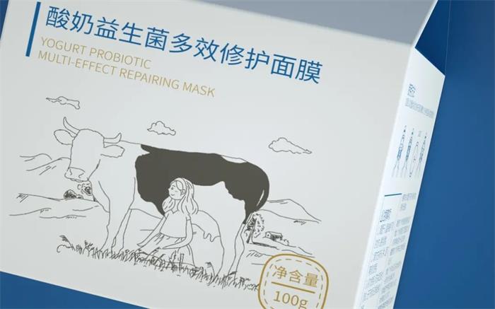不同于市面上的常規(guī)包裝,這款面膜外形上便采用了酸奶盒的造型,兩種盒型設(shè)計(jì)巧妙呼應(yīng)了,品牌名的“酸奶”屬性。極簡白的外盒背景,插畫同樣以簡筆線條勾勒了農(nóng)場實(shí)景,畫面中奶牛與女孩正相互依偎著,白云與遠(yuǎn)山、草地的景觀元素點(diǎn)綴,表明了一片生態(tài)和諧的自然環(huán)境。藍(lán)色調(diào)的運(yùn)用在純白背景映襯下形成了鮮明個性的視覺沖擊,背面繪以輔助圖標(biāo)清晰闡明產(chǎn)品信息,加上主次分明的文字設(shè)計(jì),給人一種舒適、自然的感覺。另外在斜切面上,還以拼音方格的形式,加入了“每天涂一涂”的趣味文案,消費(fèi)者能迅速了解產(chǎn)品的使用方式,也為包裝增添了幾分童趣。