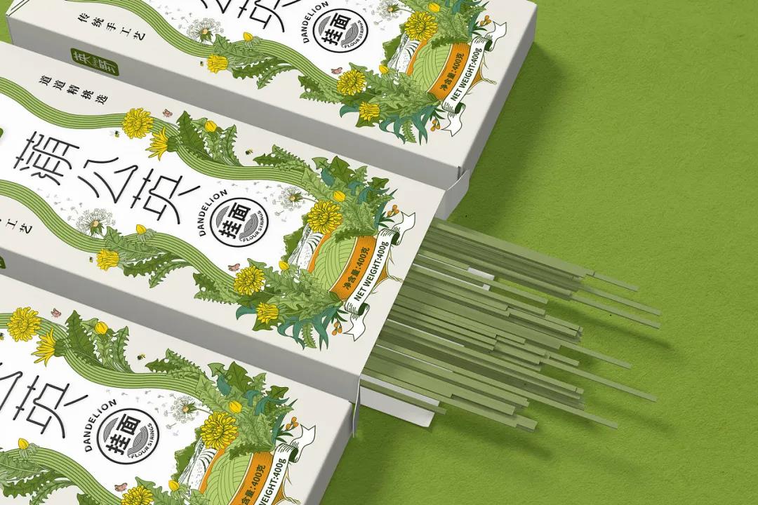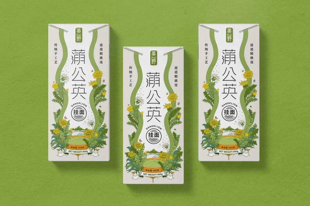 榮獲麗水山耕包裝設計獎的掛面品牌,以蒲公英為設計主題,清新質樸的設計元素,完美呈現天然健康的產品理念。其中的插畫設計是尤為出彩的地方,使用場景設定的方式,自然地融合蒲公英和面條兩大元素,直觀表達出產品的特性。插畫中設計有盛著掛面的碗,從兩側延伸出細長柔軟的綠色掛面,而蒲公英則圍繞在面條周圍,蜜蜂與蝴蝶的點綴搭配山巒田園美景,使得包裝充滿活力生機的大自然氣息。