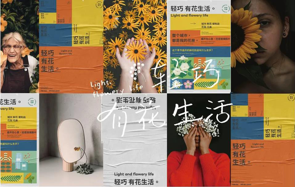 品牌色選擇葉綠、向日葵、星空、明橙,陽光燦爛的色彩搭配,符合鮮花品牌的屬性,同時傳遞鮮花給生活增添的美好。廣告語:輕巧有花生活,用文藝的語境傳達便捷和性價比,表達儀式感也可以簡單,與傳統花店產生差異化。