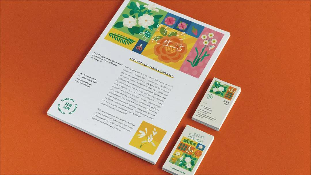 作為鮮花品牌以“鮮花”作為主視覺。但為了傳遞輕巧有花生活,融入幾何圖形及色塊,中和花的復雜,帶來更時尚簡潔的感受。最終品牌視覺運用到物料設計,豐富的物料傳遞品牌理念,讓消費者更容易了解并喜歡。