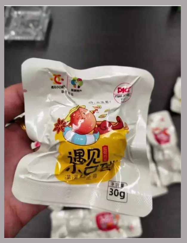設(shè)計(jì)配色時(shí)用了棕色系,既突顯了鹵蛋本身的顏色,與白底包裝袋形成鮮明對比,同時(shí)這樣一深一淺的搭配,也讓整體畫面更加明快。
