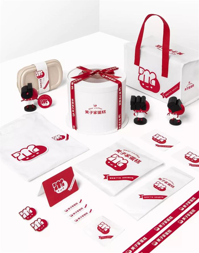 這個叫美子家蛋糕的烘焙品牌是以創始人的名字來命名的,主打法式甜品。升級后的LOGO,色調調整為雅致的紅白色,并塑造了一個可愛的IP形象作為LOGO的圖案。以品牌的主推產品蛋糕卷的形狀來設計字體,多個拐彎處體現著蛋糕卷的渾圓,同時字體的部分扁平的線條突顯現代化的浪漫。除了紅色和白色,品牌也融入了黑色的色調,對于多樣化和層次感的體現有著很大的幫助。品牌塑造的IP形象,以蛋糕卷切面的圓潤形狀為頭的部分,代表美子和美好祝福的英文“M”與之巧妙結合,擬人化處理成人的劉海,并加入開心的表情,整體形象很可愛、親切、溫暖。不同字母的劉海造型,為品牌的多IP化打下基礎,更加豐滿IP的形象。IP的身體部分由簡約的線條搭建,線條多變,幻化為多種形象,賦予IP人物的多面性,增添趣味感,觸發消費者的感性萌點,也讓人物更容易被識別。品牌采用了“綬帶”作為輔助圖形,綬帶是香港小姐授勛時斜掛在肩上的綢帶,以此加深美的概念。
