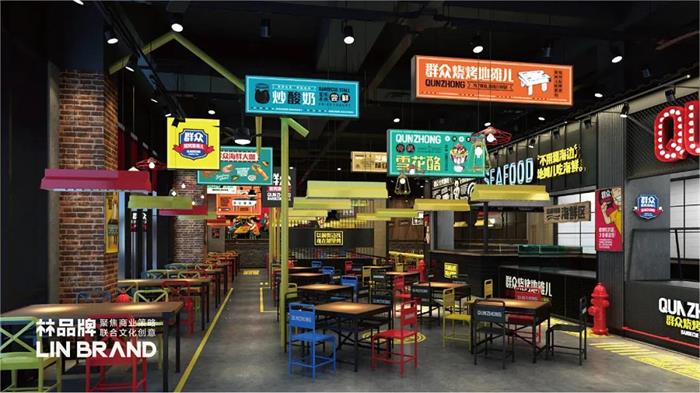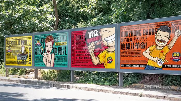 這個燒烤品牌是基于群眾的定位而進行命名的,群眾燒烤地攤兒,既表明品牌是面向大眾的、百姓的,在價格上也是親民的,同時又體現街頭市井文化,突出燒烤品類接地氣的品類屬性。品牌的LOGO標志采用了徽章式圖標,徽章與盾牌符號相結合,體現食品的安全性;紅旗飄帶體現革命屬性,也象征著只是一次燒烤改革;群眾二字格外顯眼,強調品牌的大眾親民,這些元素重新組合,構成超級圖標。革命是品牌的主題,“為了群眾,地攤兒革命”,是對地攤兒燒烤中觸發的衛生問題進行的改革,“以前街邊找,現在屋里烤”是革命后的成果,用簡單直白的話語,說清品牌的革命方向。將地攤兒文化轉移到室內,氛圍不能少,基于大眾地攤定位,以生活中的男孩、女孩、燒烤大叔等市井人物為形象,以及地攤兒的場景運用插畫的形式情景再現,還原生動有趣的地攤兒盛景。生動有趣的形象搭配俏皮的地攤兒方言,一切以群眾為中心,產品可靠、價格實惠,營造地攤兒熱鬧有趣的氛圍。用半寫實的表現手法來呈現地攤兒產品,虛實之間,盡是對地攤兒燒烤文化的喜愛和重視。
