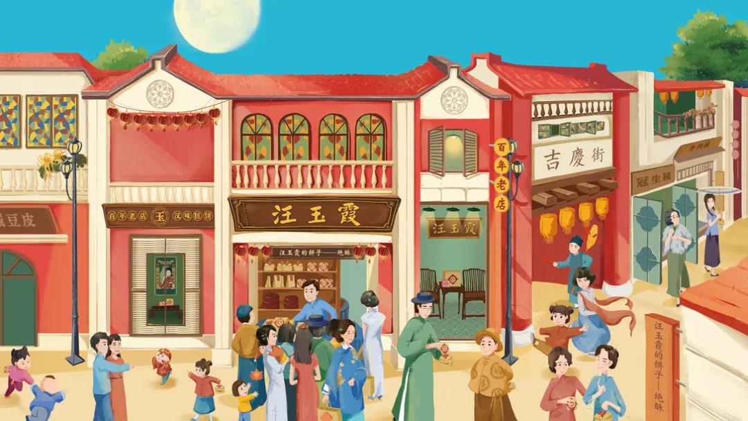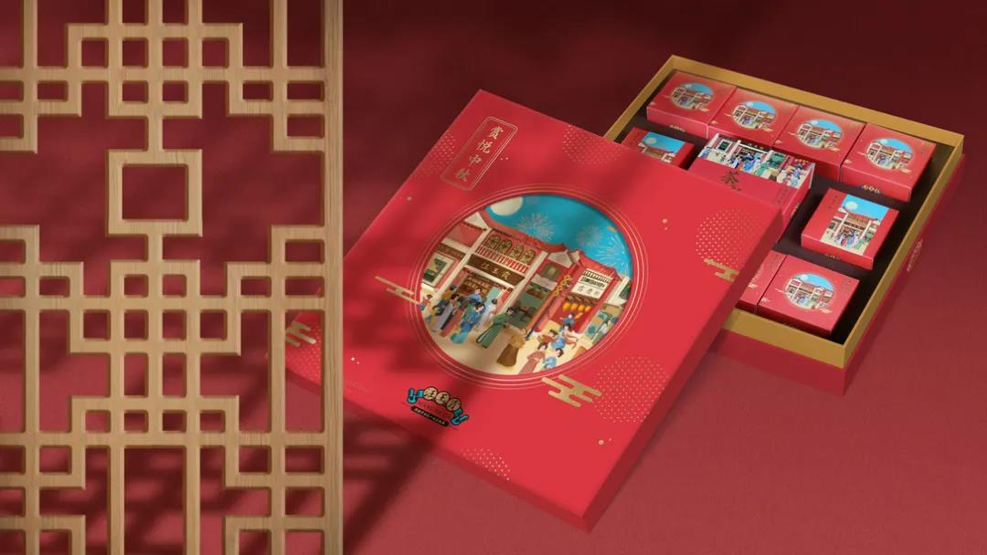 這款中秋禮盒包裝,首先外觀插畫采用了明快、簡潔的風(fēng)格,描繪民國時期的商業(yè)街、小洋樓、,紅墻坡頂、雕花欄柱及彩繪玻璃等元素,再現(xiàn)那個時代的繁華景象。