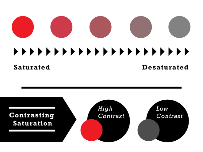 色彩強度也叫作色彩飽和度。當顏色達到最純最亮的時候,我們就說這種顏色100%飽和,而如果一個顏色越灰它就越不飽和。亮色和暗色無論是單獨還是搭配使用都能有效地在設計中形成高低對比。亮色總能吸引人的注意,尤其是當它以黑色為背景的時候,因此你可以用亮色來強調設計中的重要部分。