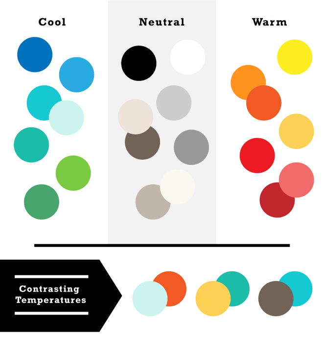 顏色可以根據色溫分成幾個類型:暖色、冷色和中性色。紅、橘、黃屬于暖色;藍、綠為冷色;黑、白、灰為中性色(在某些情況下淡棕色和棕色也屬于中性色)。在設計種加入不同色溫的顏色搭配可以創造出強烈的對比效果,特別是冷色和暖色搭配。