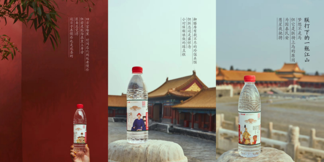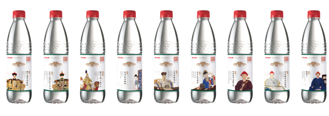 比如農夫山泉攜手故宮文化服務中心聯合跨界合作,推出9款限量版“農夫山泉故宮瓶”。以瓶身為載體,用康雍乾三代帝王,以及后妃們的人物畫像為設計主體,結合畫面人物性格,配以娛樂社交的文案,利用宮廷情節作為創意點來推廣產品。