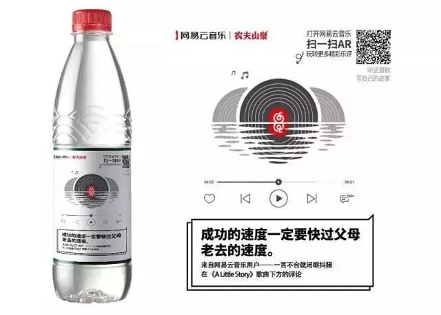 還有與網易云音樂聯合推出的合作限量款“樂瓶”,精選了30條用戶樂評印在4億個瓶子上,每一瓶水都自帶音樂和故事。句句“扎心”的樂評也為農夫山泉帶來了巨大的流量。