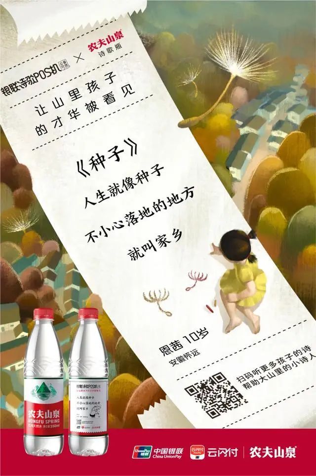 還有最近農夫山泉推出的“詩歌瓶”,把來自四川、安徽、河南山區兒童寫的24首詩歌印制在了瓶身上。有童心對大自然充滿想象力的洞察和淳樸,也有來自留守兒童的心酸,掃碼可以聽到大山的孩子讀詩,也可前往銀聯云閃付進行助力捐贈。不僅樹立了品牌形象,也把大家的目光引向了大山深處,讓更多人關注到鄉村留守兒童,讓山里孩子的才華能被更多的人看見。