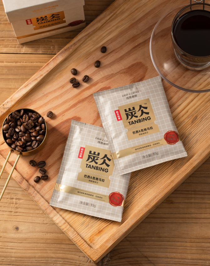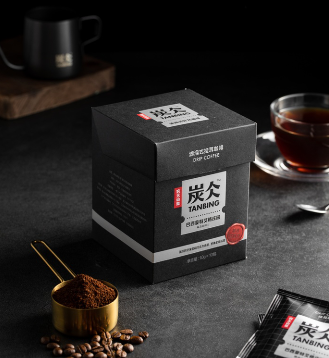 還有炭仌(bing)掛耳咖啡包裝設計也非常的高大上,以打造“0.01平方米咖啡館”為設計理念,分別設有小黑盒、小白盒和小棕盒三款包裝,類似護膚品的取名以引起消費者的新鮮感。