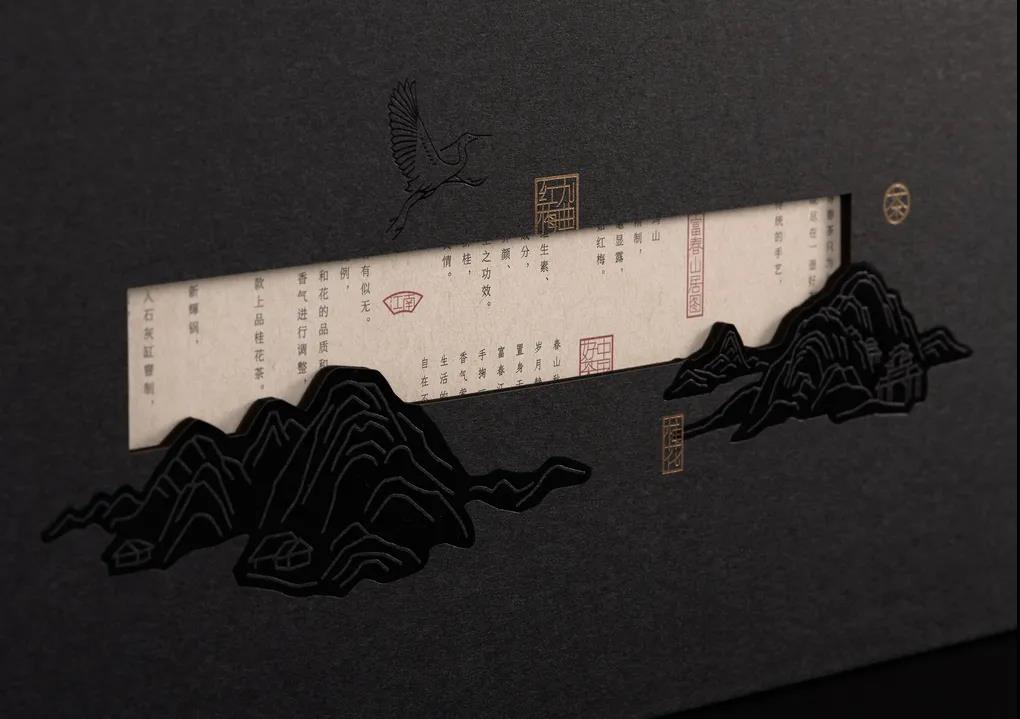 外盒通過鐳射雕刻切開了個細長的長方形視窗,沿著山脈輪廓看到內盒畫面的局部,盒內盒外畫面相結合形成包裝突出設計的獨特畫面。