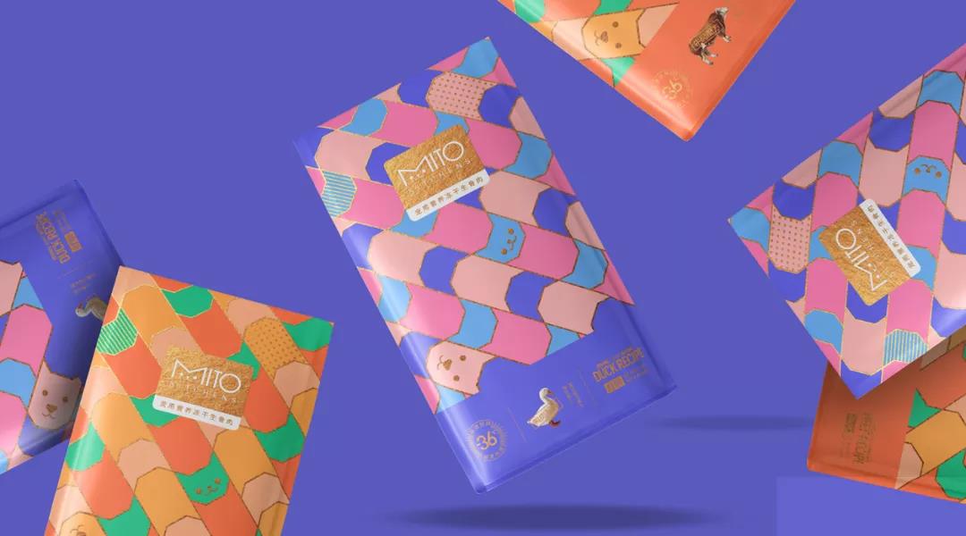 將LOGO中的 “M” 巧妙變化為一張貓臉,由此順理成章的推演出“貓頭”、“狗頭”這兩個品牌超級符號,經過無縫拼接構成產品包裝及貓牌、狗牌、膠帶、拼圖等一些列周邊產品,讓品牌形象更加生動鮮活。品牌有幾種不同的包裝外形,排列撞色下,每一款包裝都有著獨特的視覺識別性。