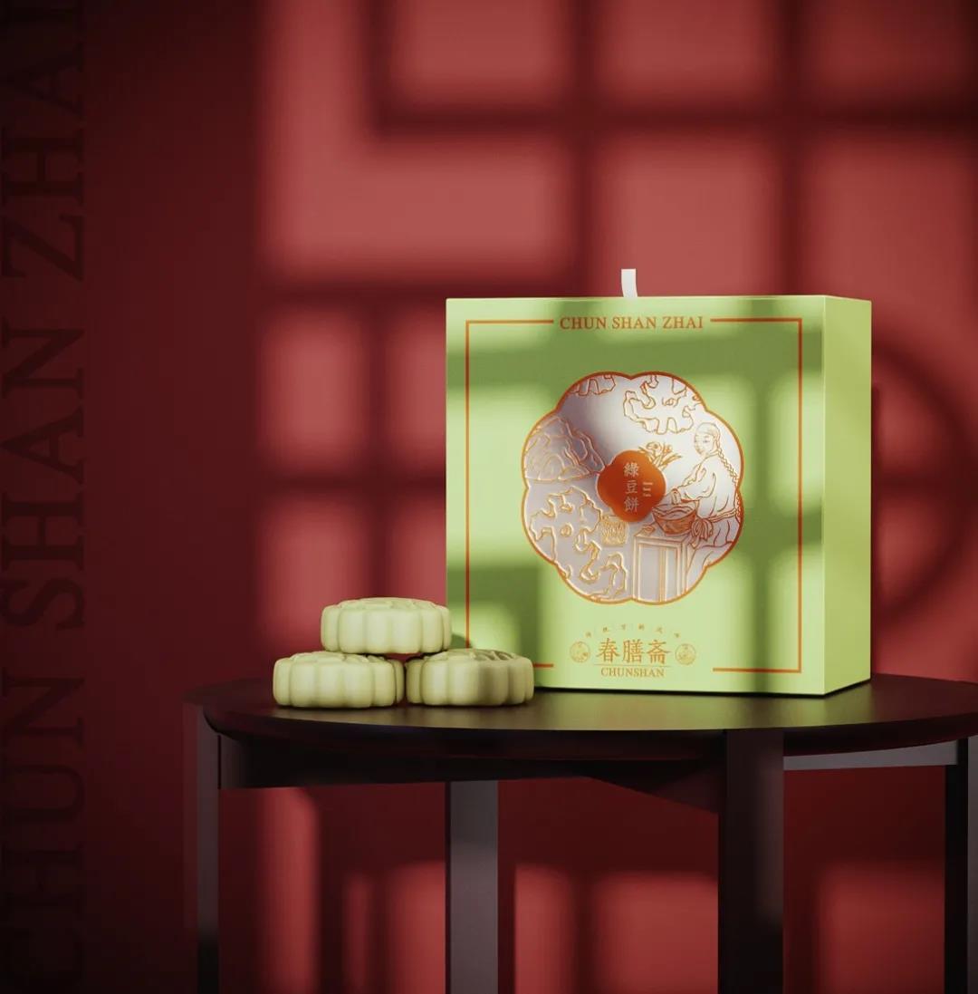 “首飾盒”系列:草綠色的外盒,以傳統(tǒng)花窗的形式展現燙印工藝,立體線條勾勒了相關的制作和購買場景,首飾盒式的設計更具美感。