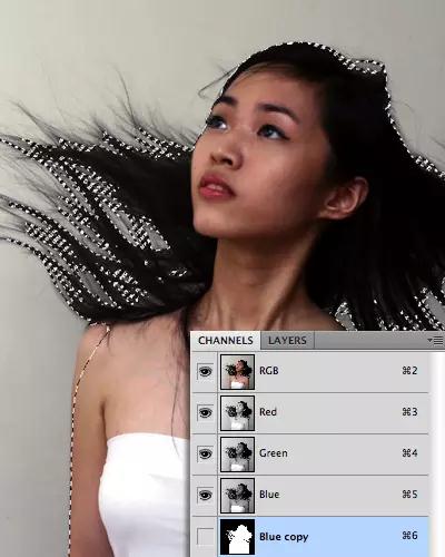 點擊每一個圖層,找出圖層背景和頭發部分顏色差異最大的圖層。然后,復制該圖層。