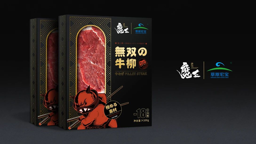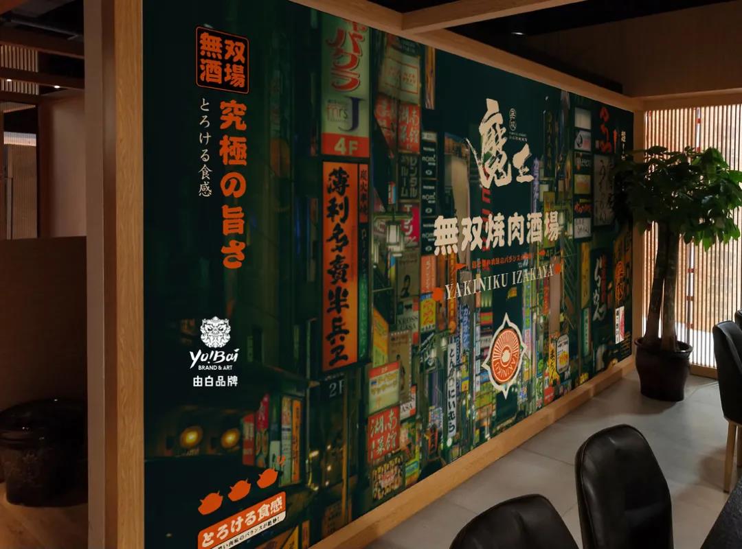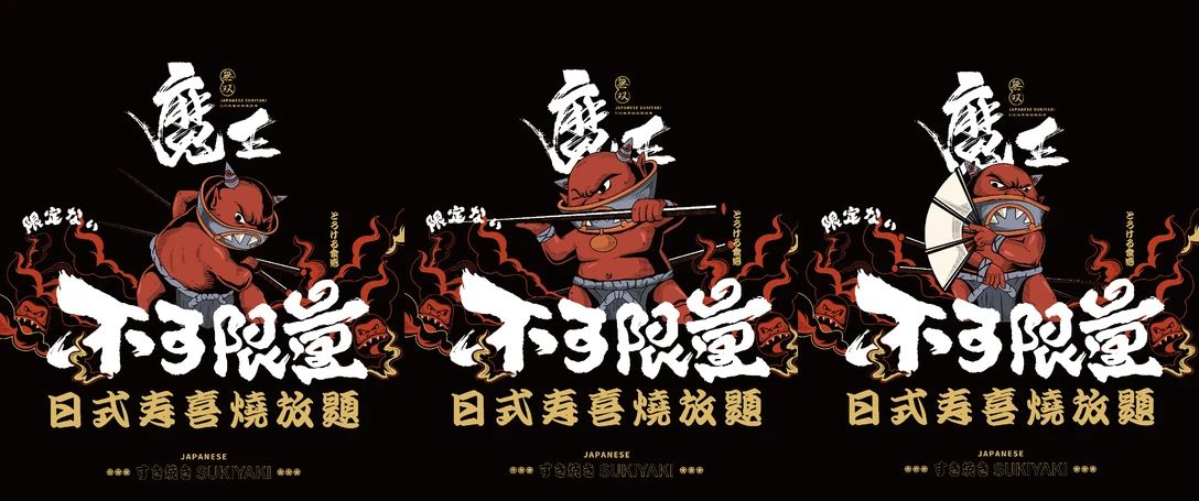 這個(gè)叫魔王無雙的日料品牌,進(jìn)行了品牌升級(jí),這次的升級(jí)部分是VI和空間,VI部分主要是圍繞IP插畫展開。因?yàn)槠放泼心鯚o雙,所以在打造符合品牌名的IP時(shí),就塑造了魔王這一個(gè)IP形象,一提起魔王,大家就會(huì)率先想到牛魔王,所以IP形象實(shí)際上是借用了牛魔王這一眾多周知的經(jīng)典形象。通體棕紅的魔王身著日本相撲出場(chǎng)時(shí)所穿的兜擋布,日料的氣息一下子就出來了。只不過魔王身上的是鎧甲兜擋布,和面具和牛角一致,面具上所畫的表情有點(diǎn)齜牙咧嘴,看起來不好惹的樣子,魔王的眉眼皺在一起,眼神堅(jiān)定,加上手里拿著武器,很像要挑戰(zhàn)別人,還堅(jiān)信自己會(huì)贏的武士。但魔王又是日料廚師,做著烤肉加料理的動(dòng)作,兇颯的表情也變得憨了起來。而由于是日料品牌,品牌設(shè)計(jì)上也采用了很多日本的元素。如浮世繪風(fēng)格的海浪,超大顏色鮮明的字帖、漫畫版式宣傳畫報(bào)等等。整體搭配很有日式漫畫的特點(diǎn),IP形象搭配不同的食材做出不同的表情動(dòng)作,非常豐滿立體,這樣的宣傳畫報(bào)也能在第一瞬間吸引人的注意,從而為門店帶來更多的消費(fèi)者。海報(bào)設(shè)計(jì)采取左右分布法則,左邊為字體部分,右邊為插畫部分。字體部分橫版分布,通過加粗突出品牌的經(jīng)營(yíng)優(yōu)勢(shì),插畫部分是一只被拆解的魚,又通過魔王、海浪、火山等元素形成一只不那么貼緊的魚,趣味性不足。