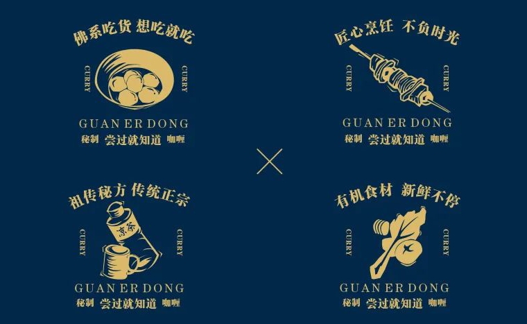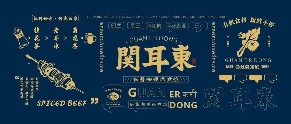 関耳東是一家從事餐飲咖喱牛雜店,而咖喱的種類很多,以國家來分,源地就有印度、斯里蘭卡、泰國、新加坡、馬來西亞等,以顏色來分,有棕、紅、青、黃、白、之別,根據配料細節上的不同來區分種類口味的咖喱大約有十多種之多,這些迥異不同的香料的匯集在一起,就能夠構成各種咖喱的各種令人意想不到的濃郁香味。VI設計的靈感來自于咖喱文化核心元素,從而提取出金箔重疊的字體設計。