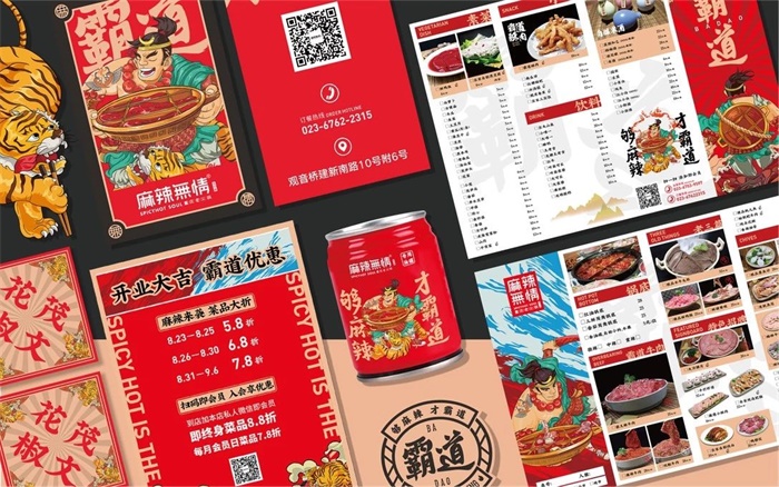 麻辣無情重慶老火鍋這家主打“麻辣火鍋”的餐廳,同樣以年輕群體為主,故用辣椒紅作為品牌的主色調以刺激消費者的食欲。采用繁字體進行設計的品牌標識,slogo“夠麻辣 才霸道”,以更強烈地確定品牌的調性和認知度,用“霸道”來詮釋重慶文化的江湖氣息。該品牌還針對重慶的江湖地域特性,和火鍋本身傳達的“熱鬧”“爽辣”屬性重新設計了“武松”這一江湖俠客形象,同時還設計了輔助圖形,包括重慶著名景點的元素等,以更有力的視覺符號提高品牌設計的識別性。