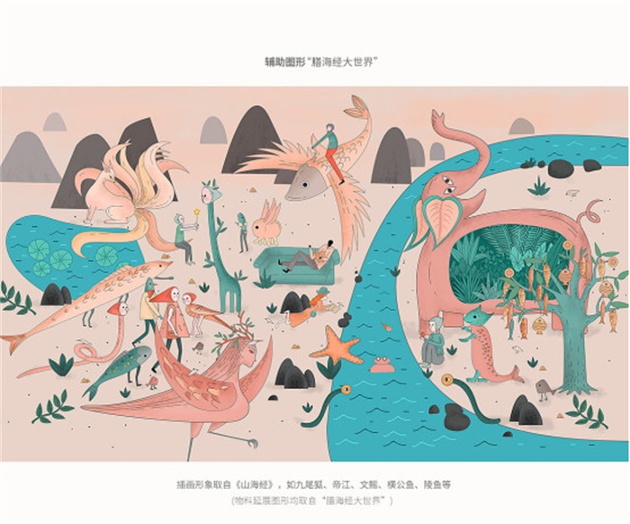 膳海經VI設計,該零食品牌面向年輕群體,為了迎合年輕人的喜好,采用插畫的設計形式進行包裝設計!吧藕=洿笫澜纭笔墙柚胶=浀男蜗筮M行創作,想要展示一個不受世俗約束的樂園,同時,顯現出膳海經食材豐富,山珍海味無奇不有。標志整體形態由圖文組成,圖的形態由輔助圖形中的動物與植物圖形組成,展現一副生機勃勃的景象,強調品牌是原生態、純天然的綠色食品。文字由品牌名“膳海經”組成,線條簡約,兼具現代時尚感和中國風韻。傳遞品牌立足現代,傳承傳統文化的品牌宗旨。