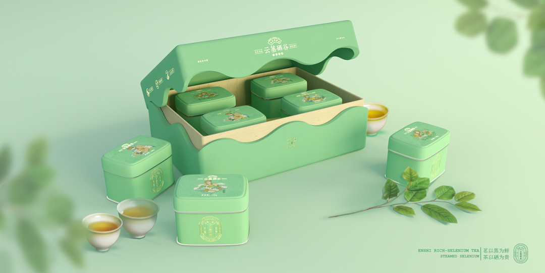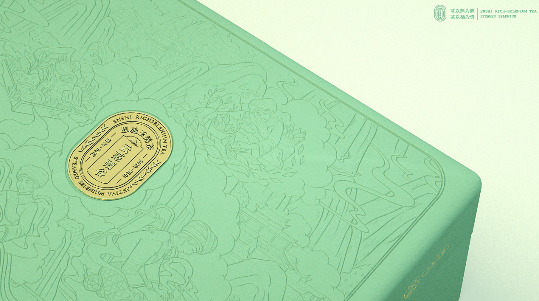 產自湖北的恩施玉露,是我國保留下來為數不多的蒸青綠茶,其已有上千年的制作工藝,也為包裝提供了茶文化傳承的故事性背景。外盒在傳統天地蓋的基礎上融入云霧紋樣,使用暗紋壓印著重表現“蒸青”的主題。LOGO處使用金屬光滑標牌設計,整體素雅的效果呈現更高級獨特性。