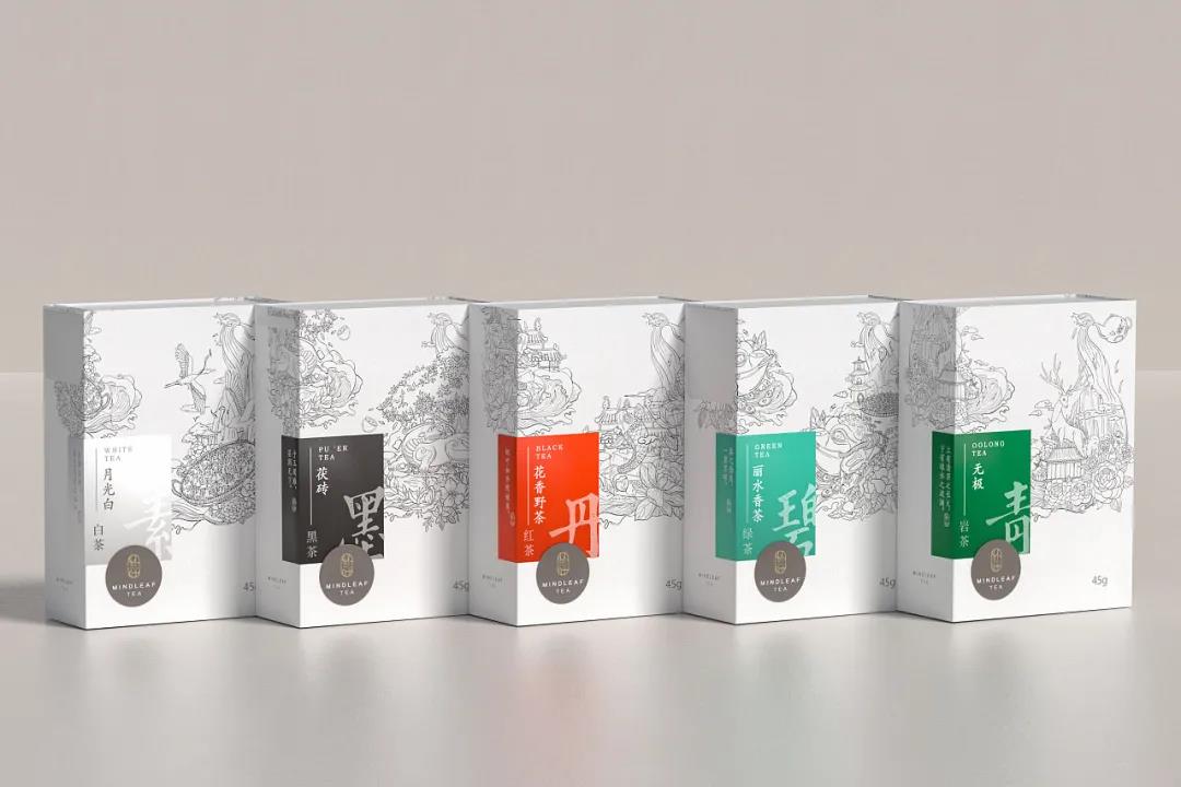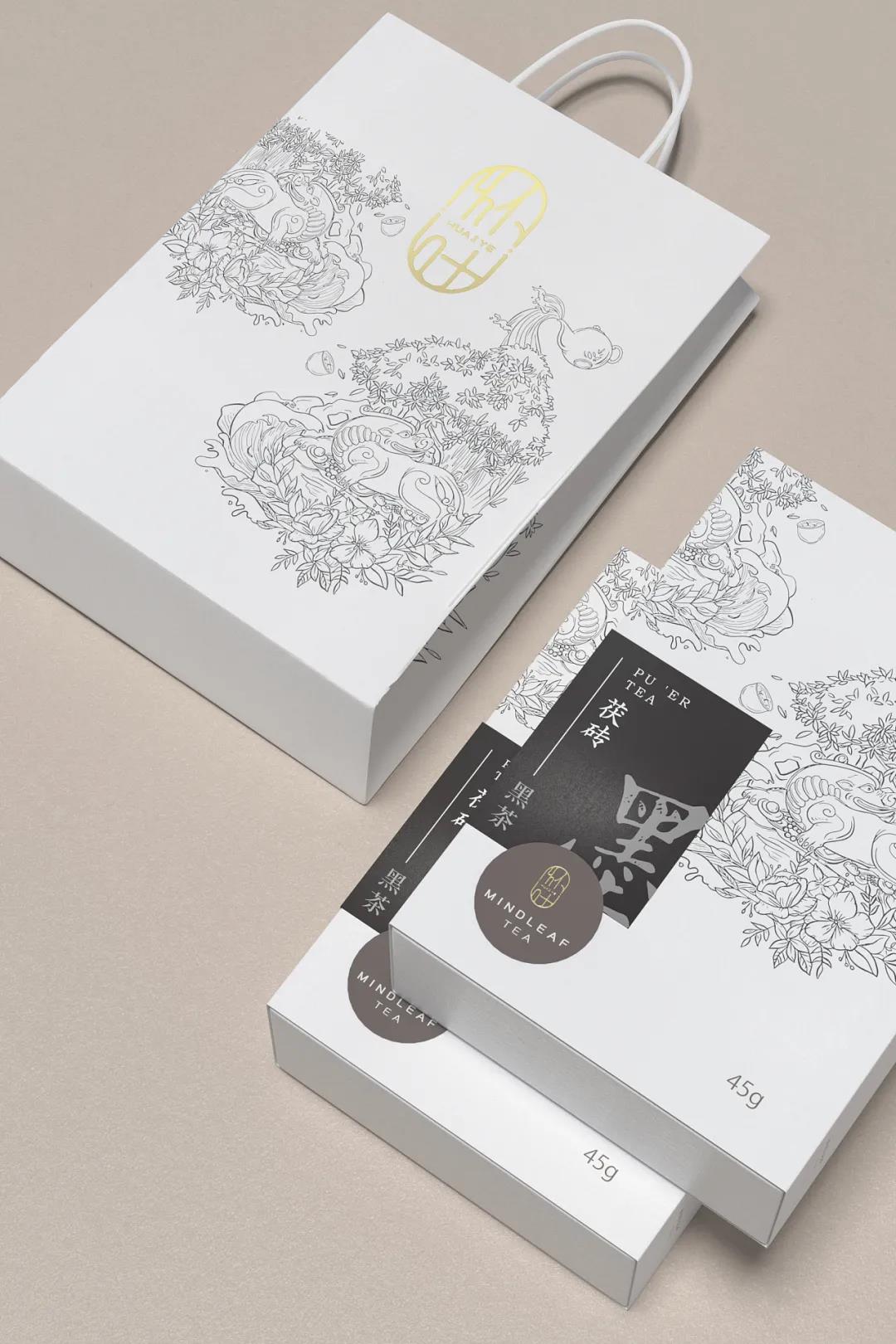 包裝挖掘了茶文化中,代表吉祥如意的傳統文化元素,以素、黑、丹、壁、青系列為產品名,分別代表白茶、黑茶、紅茶、巖茶及綠茶五大品類。整體簡約的風格設計純白背景融入灰白線描的場景刻畫,以白鶴、貔貅、錦鯉、白鹿及金蟾圖作譬喻,既是對產品品類的直觀說明,也使得品牌文化故事得以無限延伸和想象。
