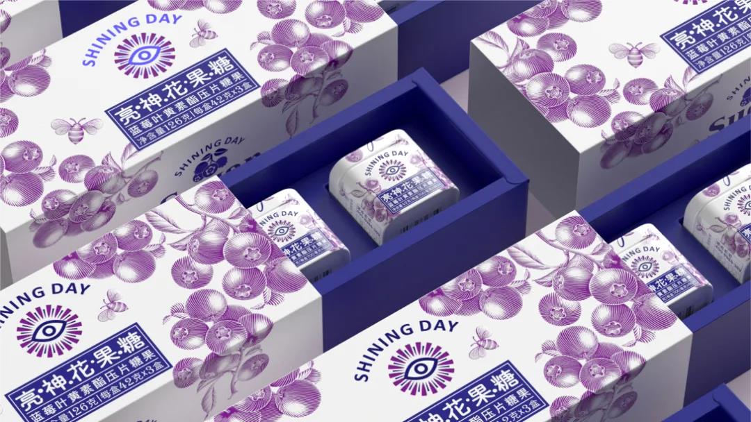 另外手繪插畫的風格,呼應了品牌所要追求的休閑感,并以藍紫雙色調的重疊碰撞,描繪出蜜蜂正在圍繞新鮮藍莓采蜜的畫面,表達出產品的口味特點,對稱式布局盡顯天然美感。抽拉式禮盒設計,節省了用戶開啟禮盒的時間,給予消費者更舒適的感觀體驗。最后產品的slogan,以“嚼一嚼”為視覺語言,激發消費者對產品使用的好奇心理,讓護眼的過程也變得輕松、愉悅。