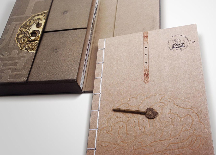 這是一套作品集,作品集正面為大門狀設(shè)計(jì),正中裝有銅門扣,意為打開(kāi)智慧之門,打開(kāi)后即可看到有擊凸于封面上的大腦。這套書(shū)的裝訂方式為古線裝,既體現(xiàn)了古人裝訂技術(shù),又體現(xiàn)了今人的智慧。